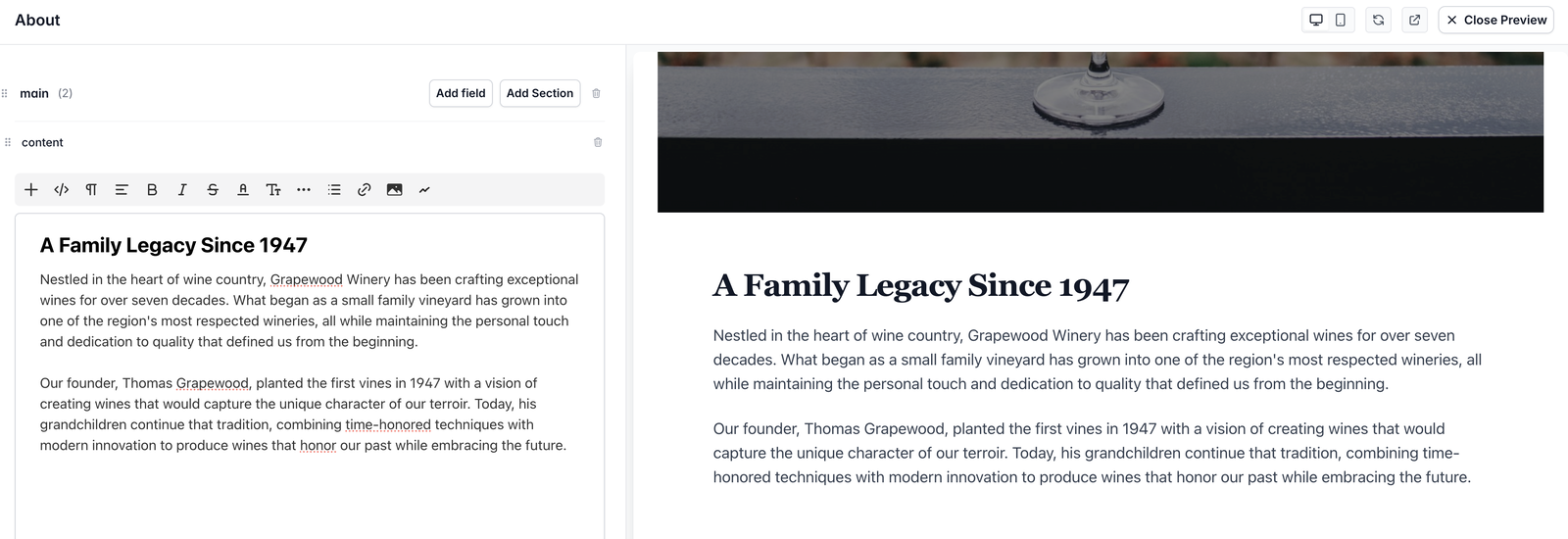 BETADeveloped a visual page editor for the CMS system with real-time preview functionality. Added a complete preview environment (1,104 lines) supporting live rendering of CMS pages with functional web components and instant visual feedback. Enables content creators to see exactly how pages will appear before publishing, reducing errors and improving content quality.